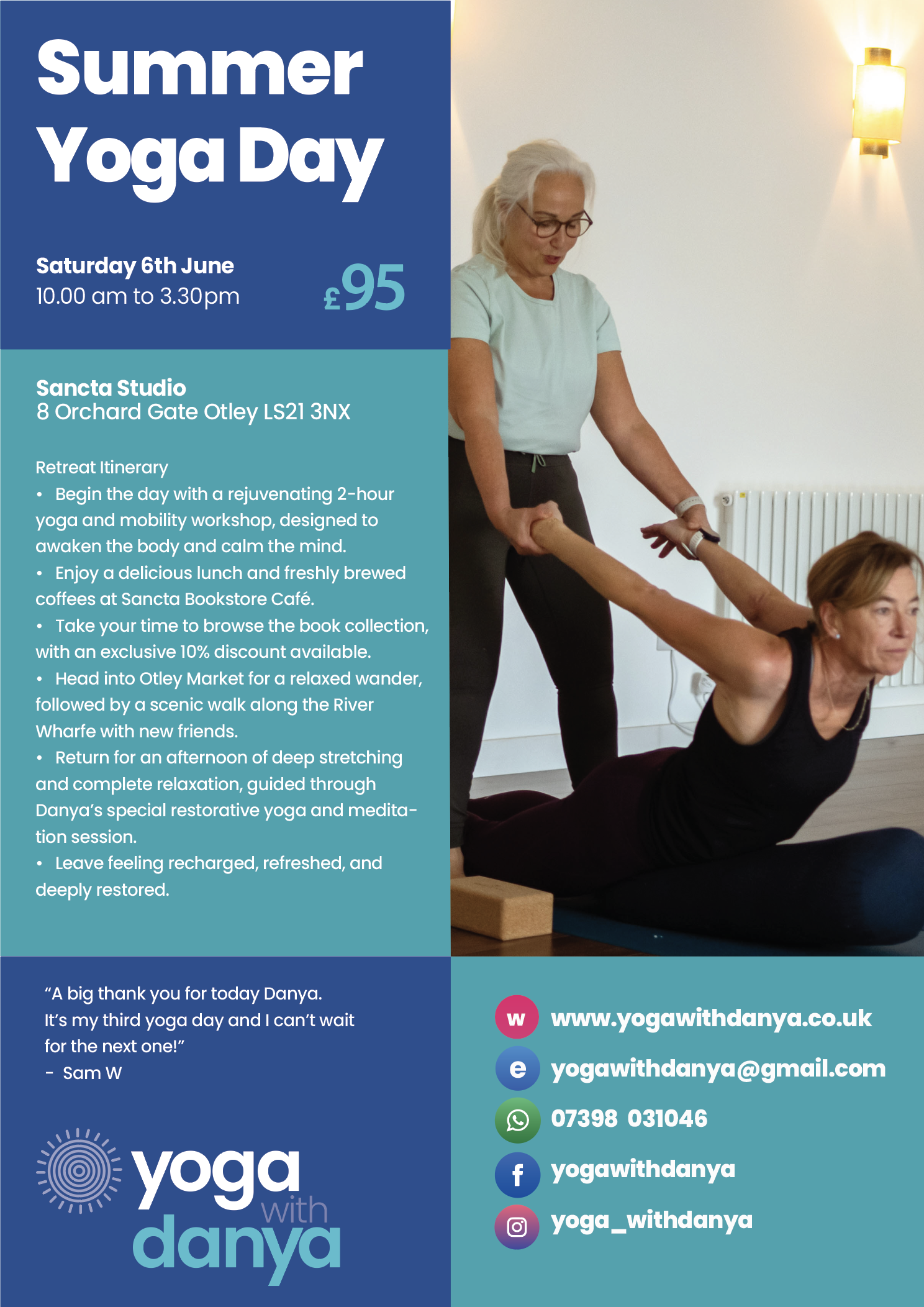 “Thank you for the yoga retreat day. I’ve never done over two hours of yoga without a break before so it was a gentle kind of “in at the deep end.” It was good to be able to go at a pace/stretch that worked for me rather than try to match what others were doing. So thank you for making it clear that we should do that and for suggesting ways we could adapt to make it work for ourselves. I could certainly feel that I’d worked different muscles to the ones I usually use the next day when I hobbled out of bed! Some stretches soon sorted that out. Thanks for creating such a welcoming and supportive space. I’m glad I took the time out to attend.”
